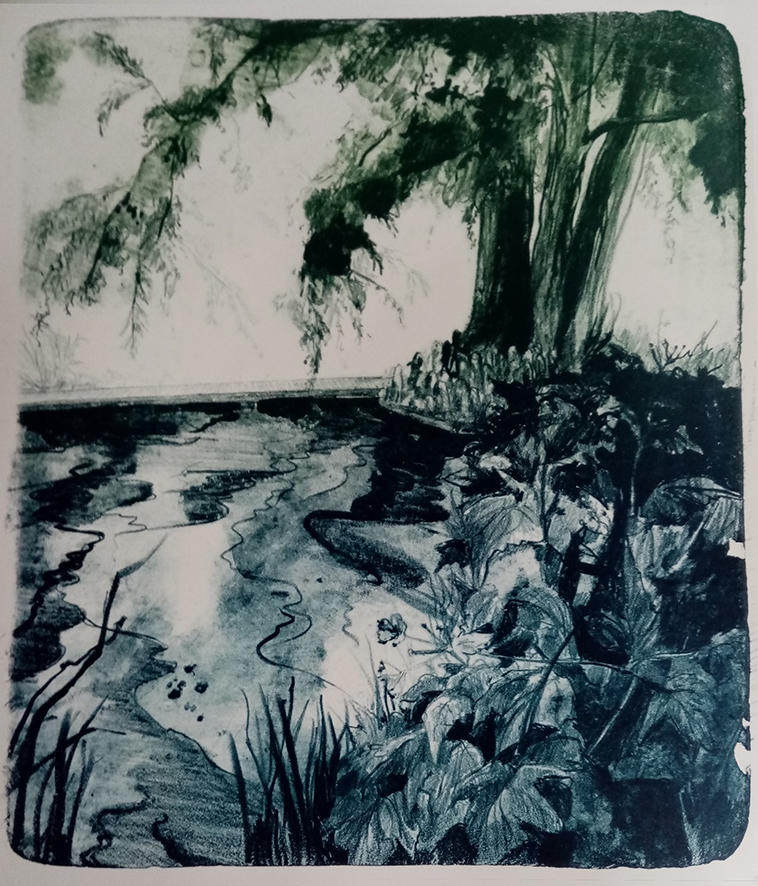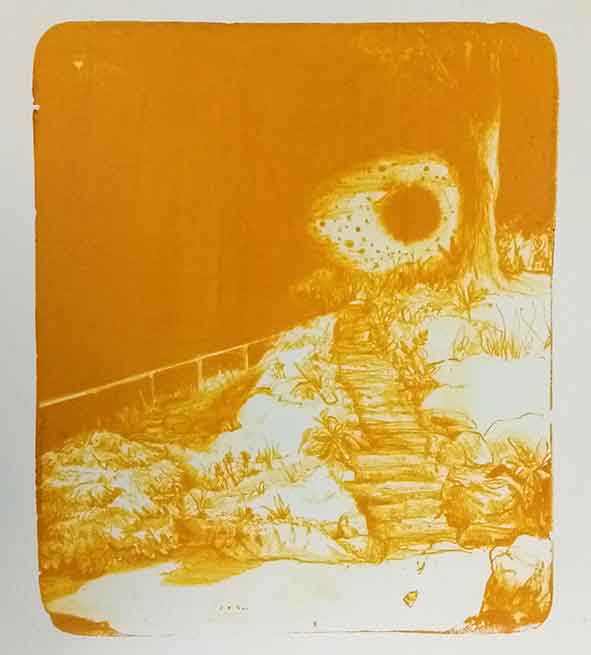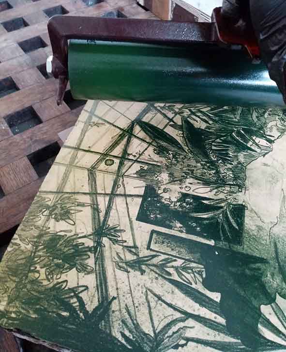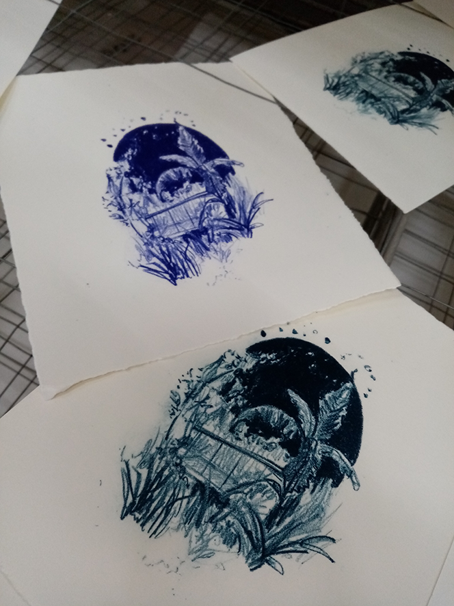 From stone to print is a lenghty process. The drawing itself takes 2/3 hours. Then I have to process the stone to make it ready for print. Each stone takes 3 days to do just that. After that I can print, which will take half a day per usual.